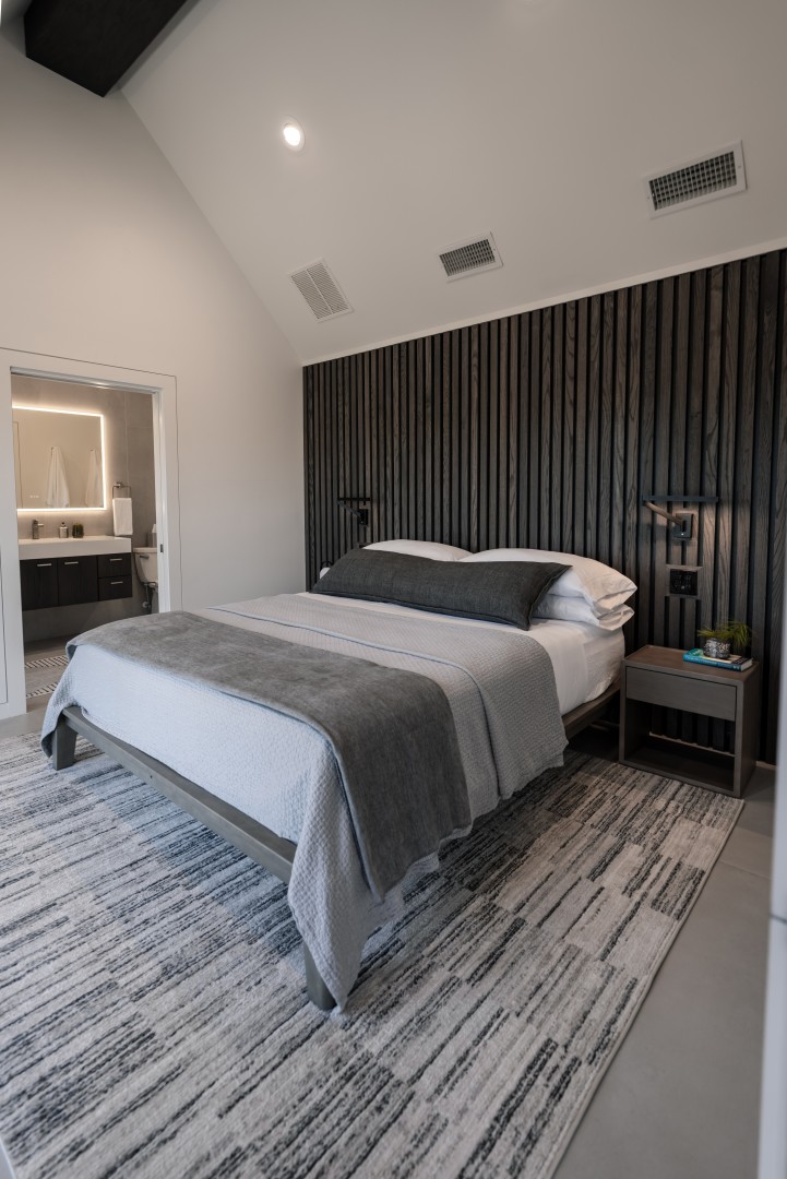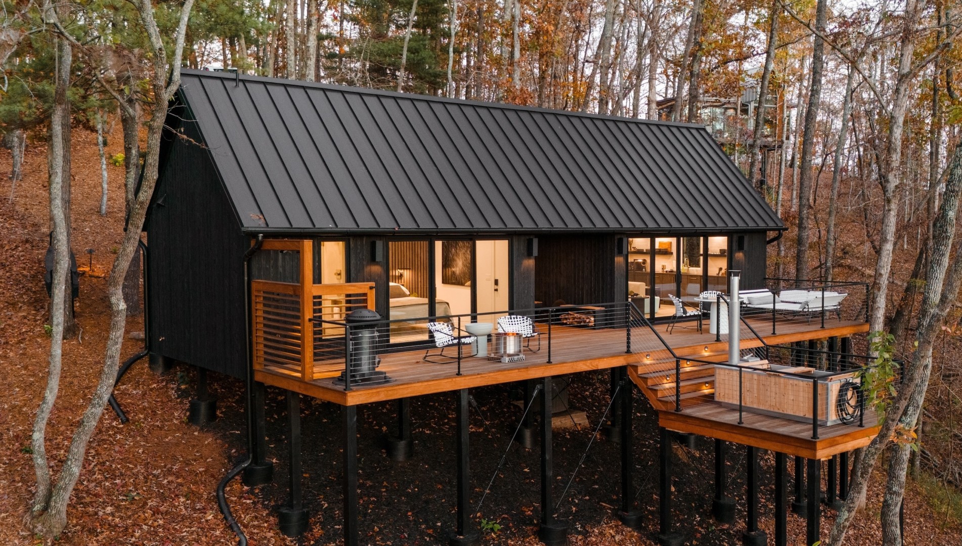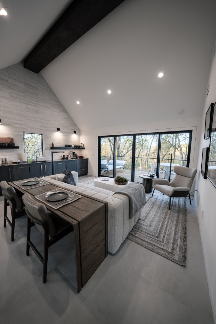 From the moment "Better Together" comes into view, it will take your breath away. The exterior is clad with Japanese Shou Sugi Ban siding, giving it a dramatic black-on-black modern look hidden in the forest. You enter the house through a classic dogtrot breezeway that opens up onto an expansive Brazilian hardwood deck with spectacular west-facing sunset views and an al fresco shower. An attached smaller deck houses the wood burning hot tub and gives the feeling that you are floating in the forest. The interior space has two living areas that equal over 600 square feet and are designed with a modern aesthetic and designer furnishings. To the left is the fully-equipped kitchenette and living area, and to the right is the bedroom and bathroom with dual shower heads and heated floors. Both areas have westward views with large sliding glass doors that lead outside, inviting you to connect with the nature around you.