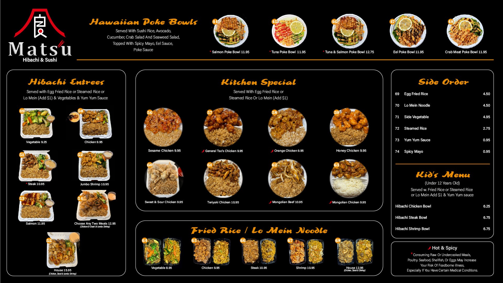 Matsu Hibachi & Sushi in Dahlonega, GA is renowned for its delectable Asian cuisine, specializing in sushi, hibachi, Hawaii Poke Bowls, and iconic Chinese dishes. Whether you're opting for takeout or dining in, our restaurant offers a delightful experience. Featuring a vibrant sushi bar, guests can witness the art of sushi rolling firsthand.