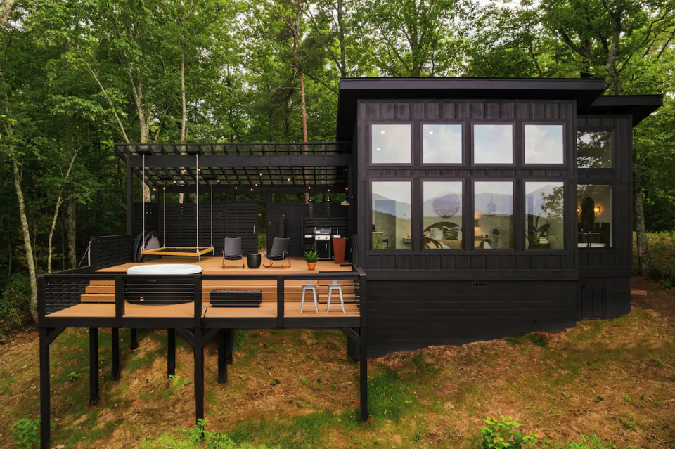 Modern studio cabin in the North Georgia mountains! Hear the birds singing to you while enjoying outdoor luxuries including hot tub, hanging net bed, gas fire pit, breakfast bar, and showers with a million-dollar view you won’t believe until you see it in person.