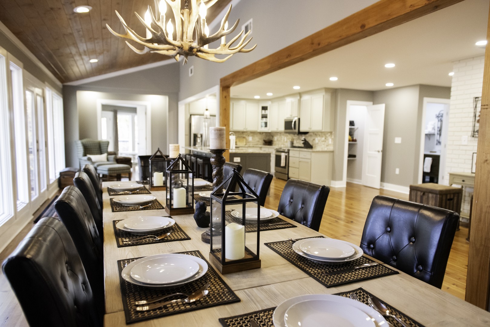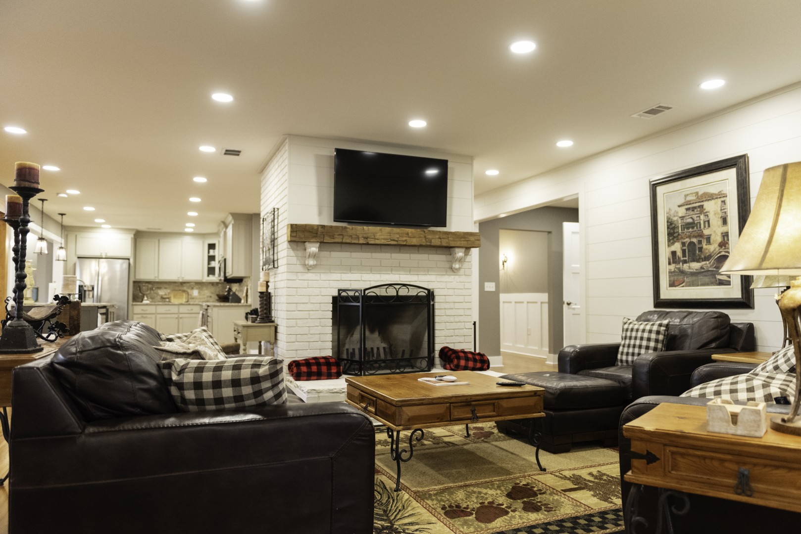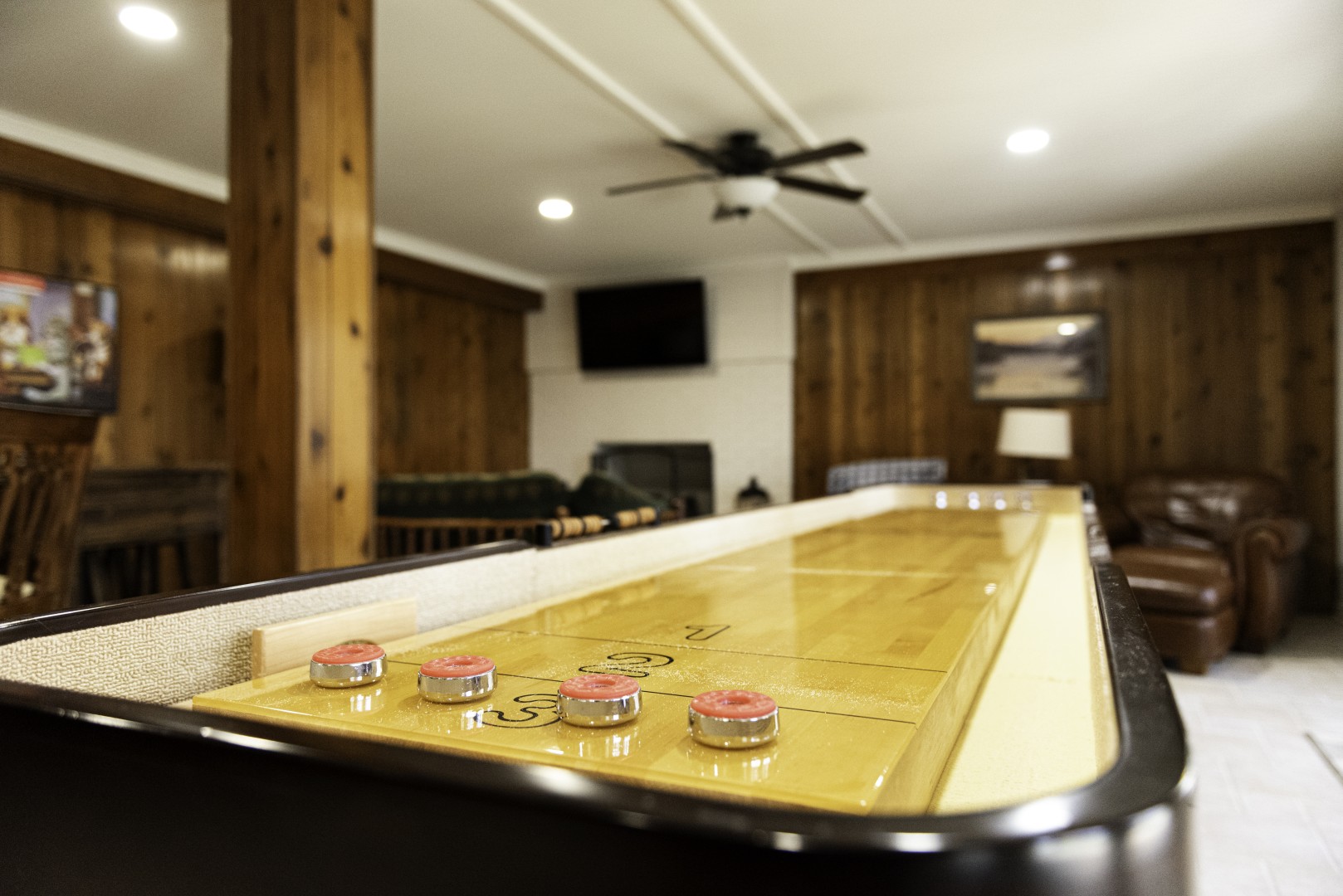 While at your stay everything you need will be included, including a well-equipped kitchen, bed and bath linens, full-service bar with ice maker, three large fireplaces, laundry room, Wi-Fi, smart TVs, game room with shuffleboard table and poker table, patio with covered barbeque/grill area, outdoor fireplace, and hot tub. The lodge will easily accommodate 10 guests and is a non-smoking facility. All four bedrooms are on the main floor, with three suites having a king bed (one with an extra sofa bed), and the final bedroom has two sets of bunk beds. Each bedroom has its own ensuite bathroom.