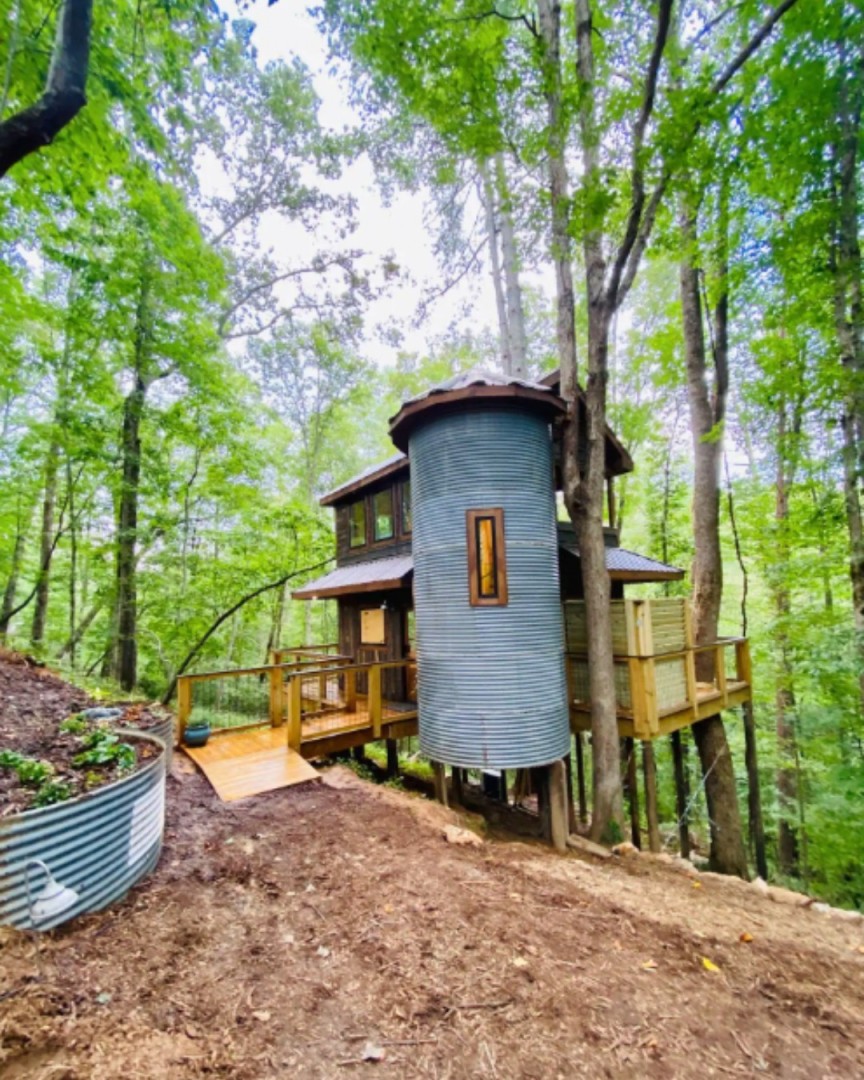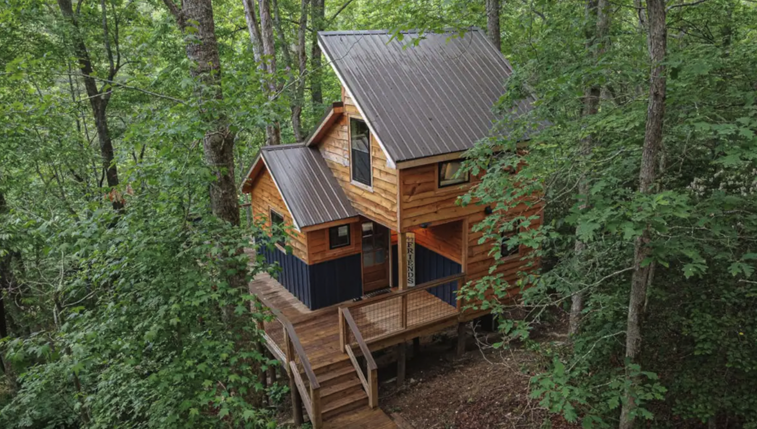 Secluded treehouse on over 80 acres that offers a perfect blend of nature and modern amenities. Get the feeling of being miles away from anything while only 2 miles away from the downtown Dahlonega, GA square (a popular tourist destination for wineries, weddings, restaurants, hiking, and much more). Enjoy the sounds of a babbling creek from the back deck, rain on the metal roof, or even a private outdoor shower. Perfect getaway for a couple or for a small family.