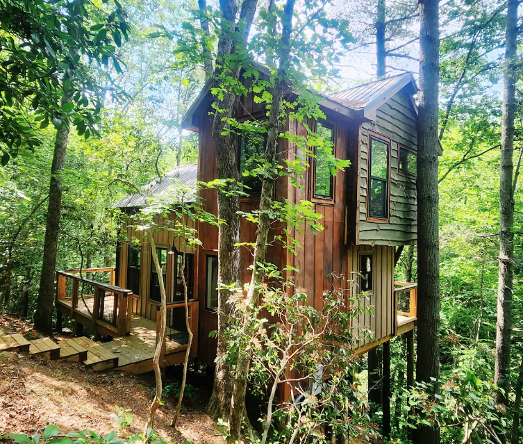 Secluded treehouse on over 80 acres that offers a perfect blend of nature and modern amenities. Get the feeling of being miles away from anything while only 2 miles away from the downtown Dahlonega, GA square (a popular tourist destination for wineries, weddings, restaurants, hiking, and much more). Enjoy the sounds of a babbling creek on the back deck or rain on the metal roof. Perfect getaway for a couple or for a small family.