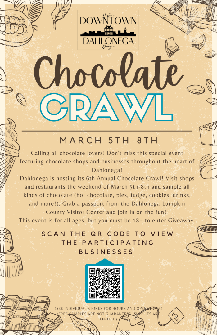 The Dahlonega Main Street Program is hosting the 6th Annual Chocolate Crawl continues to bring locals and visitors together for a delicious adventure.