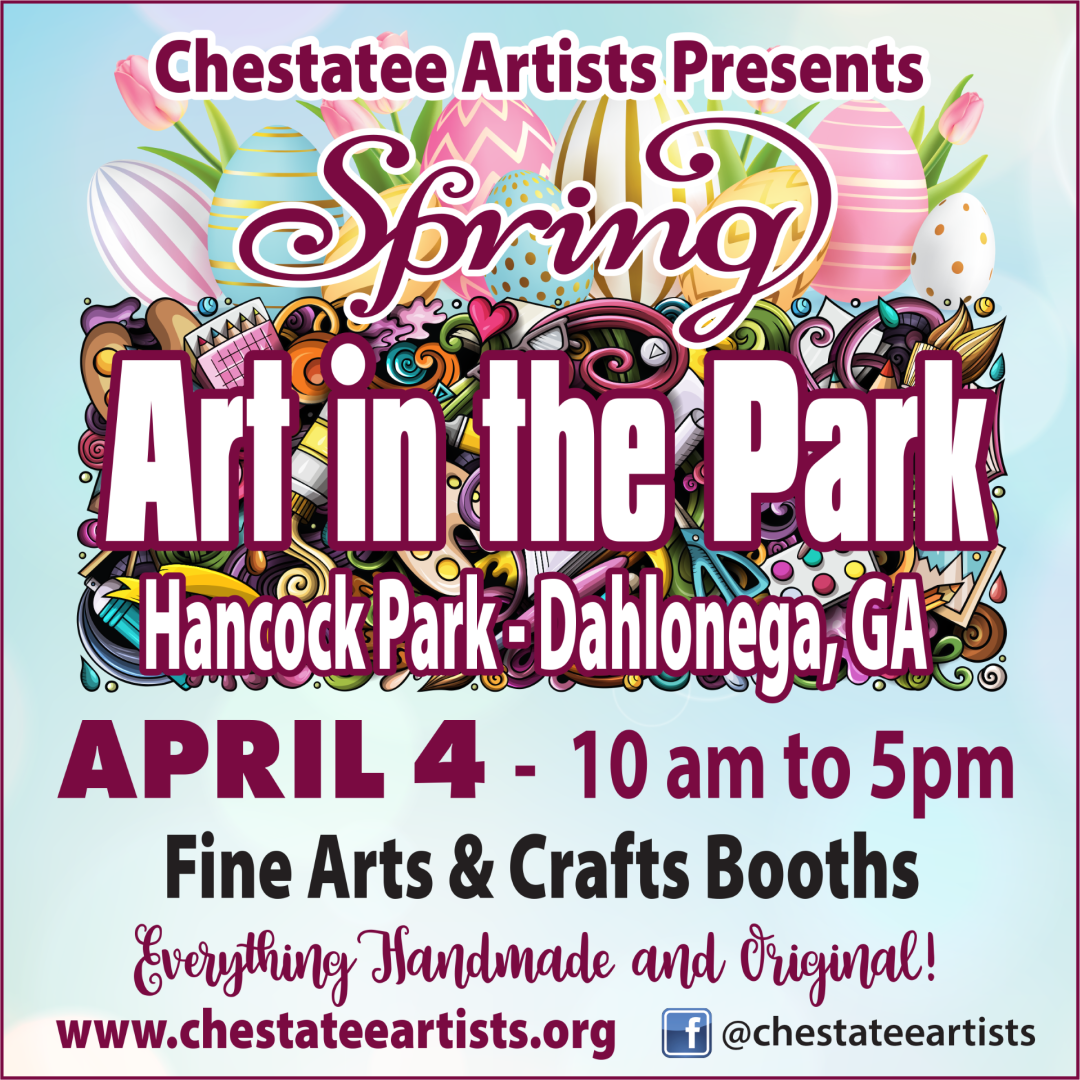 Chestatee Artists presents our Spring ART IN THE PARK, April 4, in Hancock Park. We will have new and returning artists who design and create artwork of a variety of media. Come and see paintings, jewelry, pottery wood arts, fiber arts, chainsaw carvings, faith themed t-shirts, metal arts, tasty jams and jellies, plant-based medicinals, and an author with her children's book! Come between 10 am and 5 pm and see all of the unique artwork from local artists.